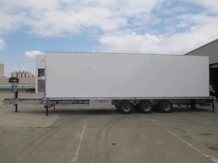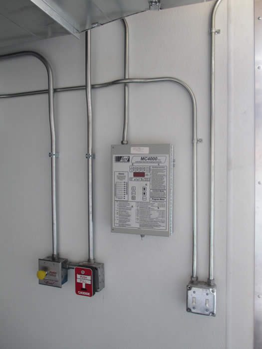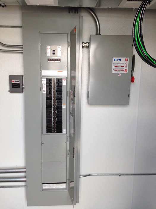 The mobile command center shown below is 42'L overall x 8'-6"W x 11'-4"H (34'L deck) equipped with (3) 12,000 lb axles (36,000 lb GVWR), all alumimum shelter, 32'L x 8'W x 8'H, equipped with (2) 6-ton air conditioners on the front (equipped with heaters), full length ceiling mounted air ducts, and 400A electrical panels on the outside rear for 3 phase power: 400A Appleton connector for utility power, 400A Appleton connector for generator power, 400A utility disconnect, 400A ATS; plus the 400A breaker panel inside, and a 125A single phase sub-panel. This MCC below also includes a cable entry panel on the left rear and an alarmed fire suppression system inside.